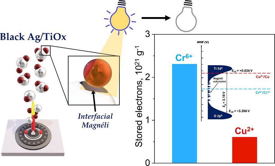 Dark photocatalysts allow storage of photogenerated electrons and their post-irradiation use under no-light conditions. This requires the development of materials able to perform photogeneration of electrons, long-term in situ charge storage, and controlled transfer to acceptors on demand. Herein, we present {Black-TiOx/Ag0} nanohybrids consisting of {Black-TiOx} decorated with plasmonic silver Ag0 nanoparticles produced by flame spray pyrolysis (FSP). A library of {Black-TiOx/Ag0} nanocomposites was engineered, with precise control over Ag0 loading and {Black-TiOx} particle size. Under dark photocatalysis conditions, pre-irradiated {Black-TiOx/Ag0} exhibits significant capacity to store and transfer electrons to Cr6+ or Cu2+ ions under dark conditions. Specifically, pre-irradiated {Black-TiOx/Ag0} provides 0.6 × and 2.3 × 1021 electrons g-1 of {Black-TiOx/Ag0} to Cr6+ ions and Cu2+ ions, respectively, for at least 120 min. Operando electron paramagnetic resonance (EPR) spectroscopy reveals that Magneli-TiOx surface sites on {Black-TiOx/Ag0} act as efficient trap/store units of the photoexcited electrons. The interfacial Magnéli islands introduce sub-gap energy states in TiO2, drastically improving both electron storage and visible-light activity compared to conventional TiO2/Ag0. Photoluminescence and photoelectrochemical analyses show that {Black-TiOx/Ag0} exhibits high electron mobility and low hole/electron recombination rates. This analysis reveals that the interfacial Magnéli islands in contact with Ag0 act [i] as efficient electron storage pools of surface electrons under sunlight and [ii] as long-lived electron donors in the dark. This work provides a first proof-of-concept for {Black-TiOx/Ag0} nanocomposites as photochargeable materials, enabling decoupled dark redox chemistry, while highlighting FSP as a versatile and scalable route for their synthesis.