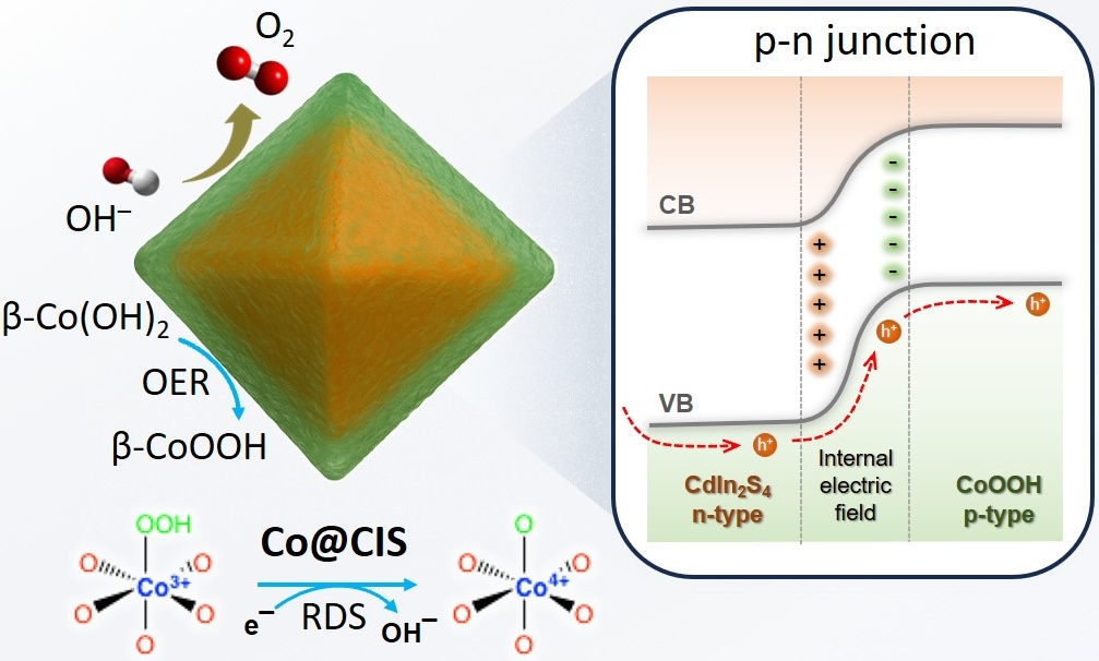 Semiconductor-based electrocatalysts with tunable electronic structures and efficient interfacial charge transfer hold great promise for sustainable energy conversion. In this study, we present a novel nanostructured electrocatalyst composed of β-Co(OH)2 nanolayers uniformly anchored on CdIn2S4 (CIS) thiospinel nanoparticles, synthesized via a combined hydrothermal and photochemical deposition strategy. Comprehensive structural and spectroscopic analyses, supported by theoretical calculations, demonstrate the formation of a well-defined p–n heterojunction at the β-Co(OH)2/CIS interface, which promotes directional charge transport and reduces interfacial resistance, collectively accelerating oxygen evolution reaction (OER) kinetics. The improved electrocatalytic activity arises from the synergistic effects of interfacial electric field modulation, topotactic electrochemical transformation of β-Co(OH)2 into catalytically active β-CoOOH, and stabilization of high-valent Co4+ species under anodic polarization. The optimized 10 wt% Co@CIS catalyst achieves a low overpotential of 294 mV at 10 mA cm–2, a small Tafel slope of 61.2 mV dec–1, and excellent operation stability over 100 h in alkaline electrolyte. When integrated into a two-electrode alkaline water electrolyzer, it enables overall water splitting at a cell voltage of only 1.60 V at 10 mA cm–2. These results highlight the critical importance of interfacial engineering in designing high-performance, durable and cost-effective electrocatalysts for renewable energy conversion technologies.
