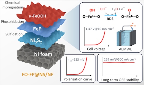 Advancing alkaline water electrolysis for renewable energy technologies requires oxygen evolution reaction (OER) electrocatalysts that combine high activity, long-term durability and mechanistic clarity. Herein, we report a hierarchically engineered α-FeOOH–FeP/Ni3S2 electrocatalyst supported on 3D Ni foam, synthesized via a stepwise hydrothermal sulfidation, gas-phase phosphidation, and chemical impregnation strategy. This integrated multi-phase architecture exhibits strong interfacial coupling, enabling accelerated charge transfer and favorable OER kinetics under alkaline conditions. In-situ/operando Raman, UV-vis, and electrochemical impedance spectroscopy uncover dynamic surface reconstruction under operating conditions, with reversible Fe3+/Fe4+ redox cycling within the α-FeOOH overlayer, pinpointing transient Fe4+–O species as key catalytic intermediates. The optimized catalyst attains low overpotentials of 223 and 251 mV at 10 and 100 mA cm-2 and sustains industrial-level operation (> 500 mA cm-2) with outstanding durability in 1.0 M KOH. When deployed in a symmetric anion exchange membrane water electrolyzer, it delivers a cell voltage of only 1.47 V at 10 mA cm–2, outperforming benchmark noble-metal-based systems. Mechanistic studies including kinetic isotope effect and pH-dependent analysis support a proton-coupled electron transfer (PCET) mechanism, with O–H bond cleavage as the rate-determining step. These findings elucidate key structure-function relationships and establish a modular design strategy for advanced alkaline OER electrocatalysts.